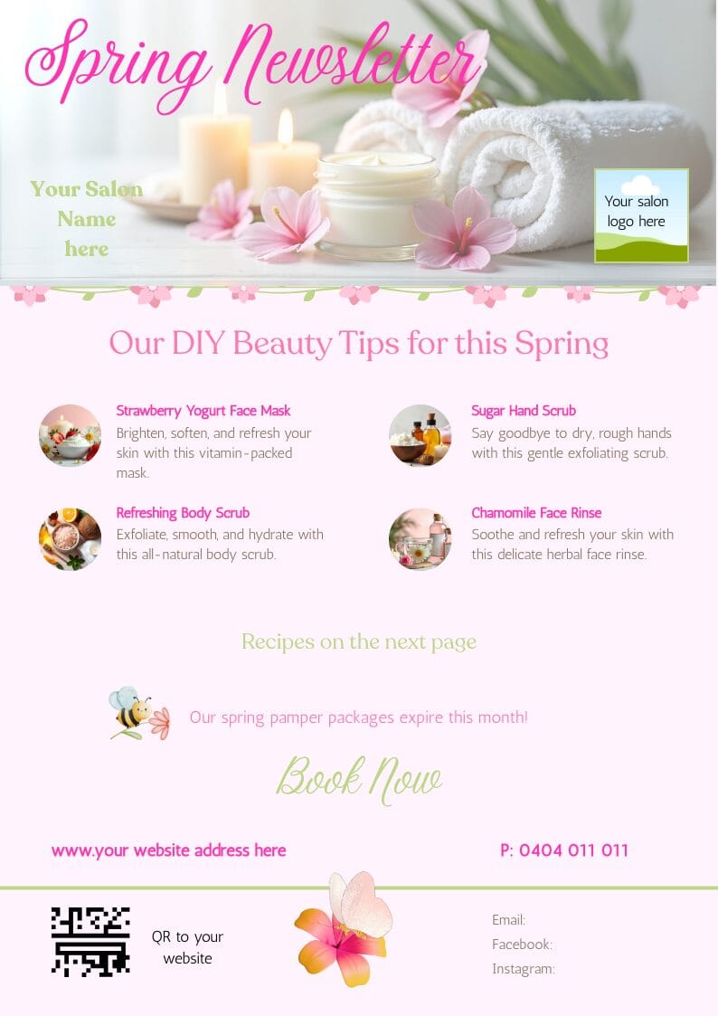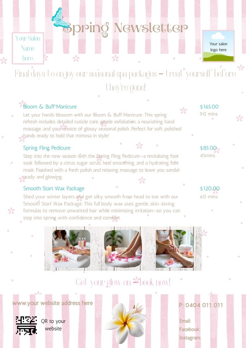 • 1 x A4 Printable Canva Flyer – highlight seasonal packages and makeover specials