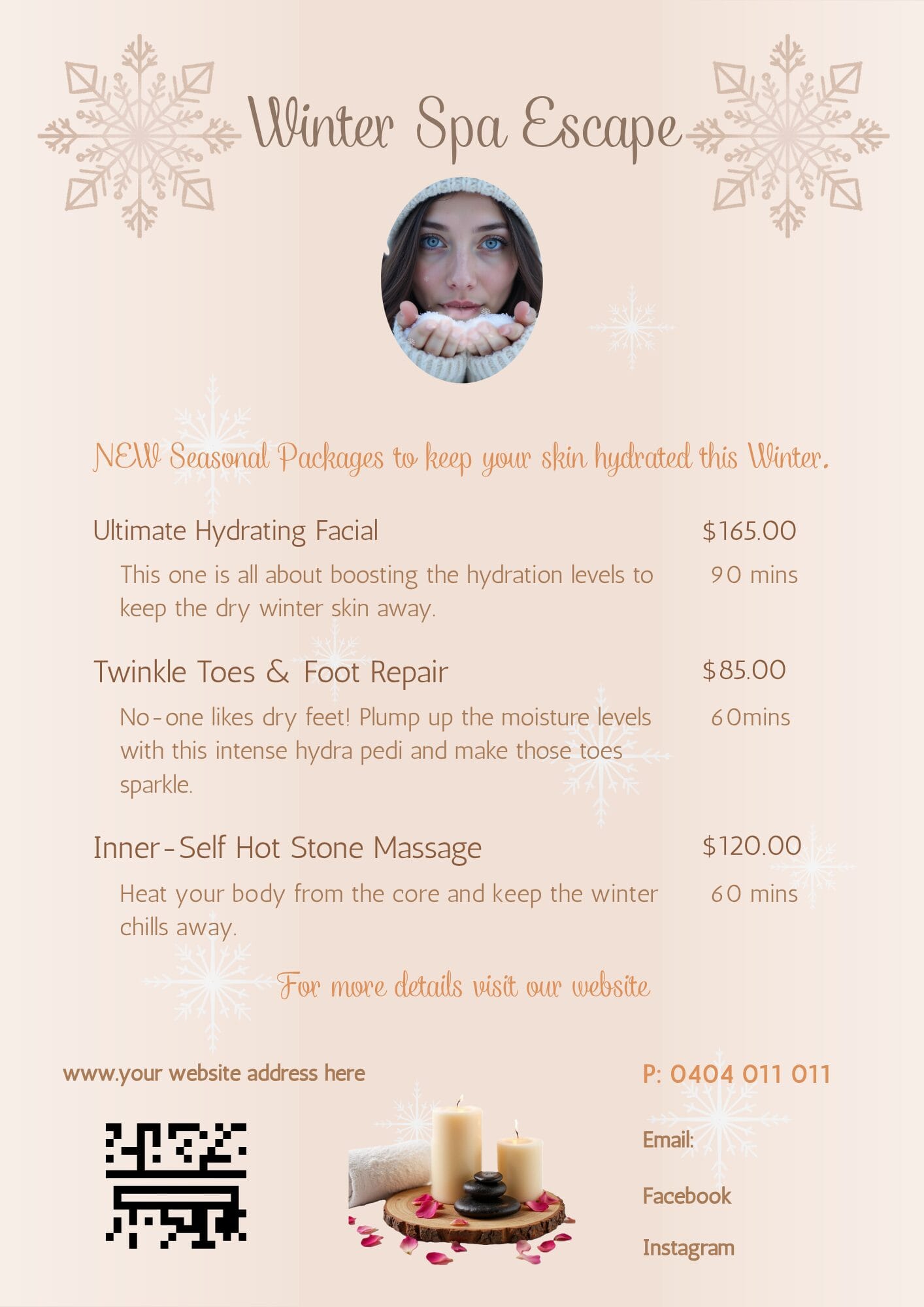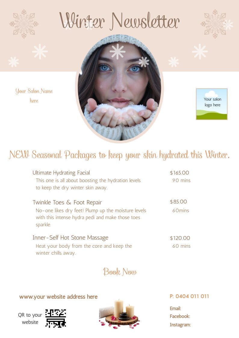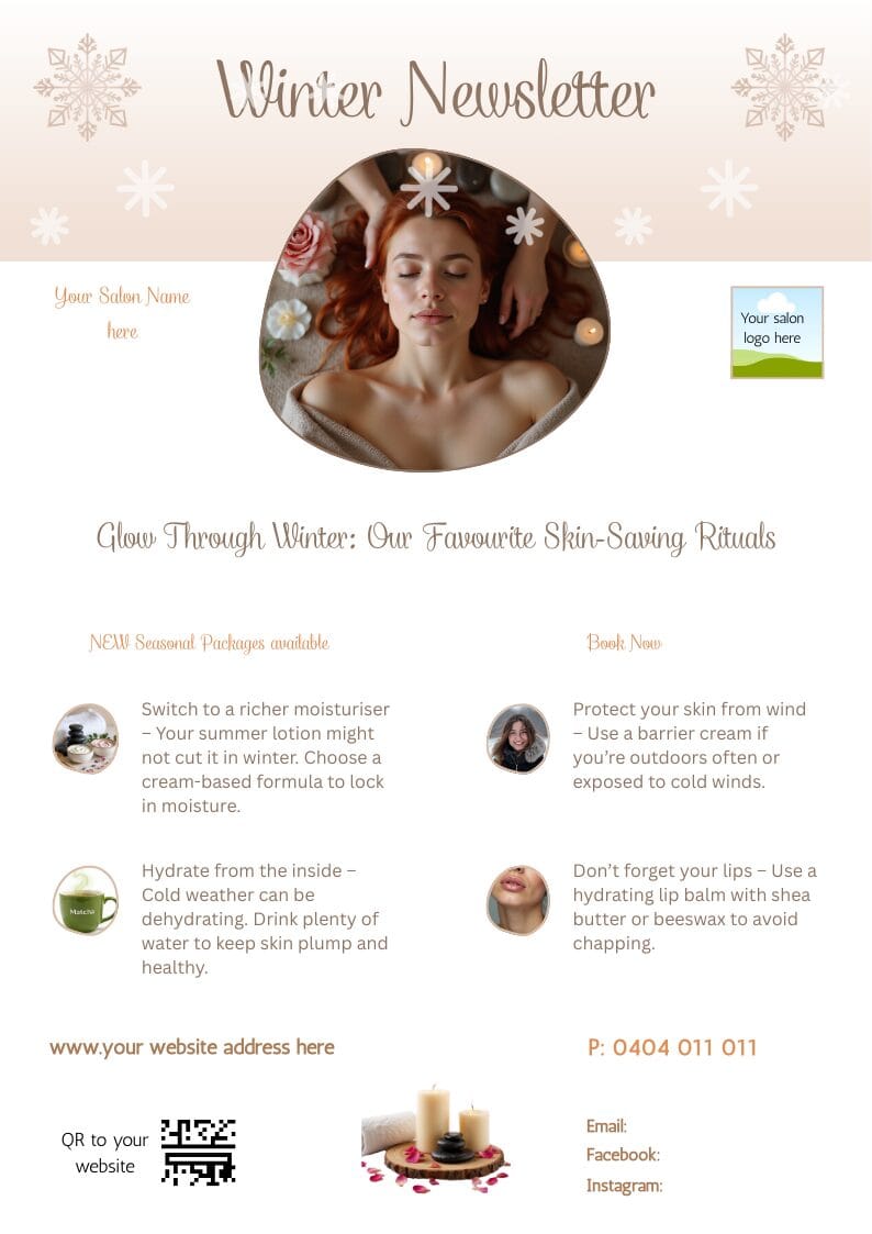Designed for beauty salons, spas and solo operators, this collection helps you market winter treatments in a way that feels restorative, professional and quietly luxurious — perfect for clients craving a little escape during the colder months.