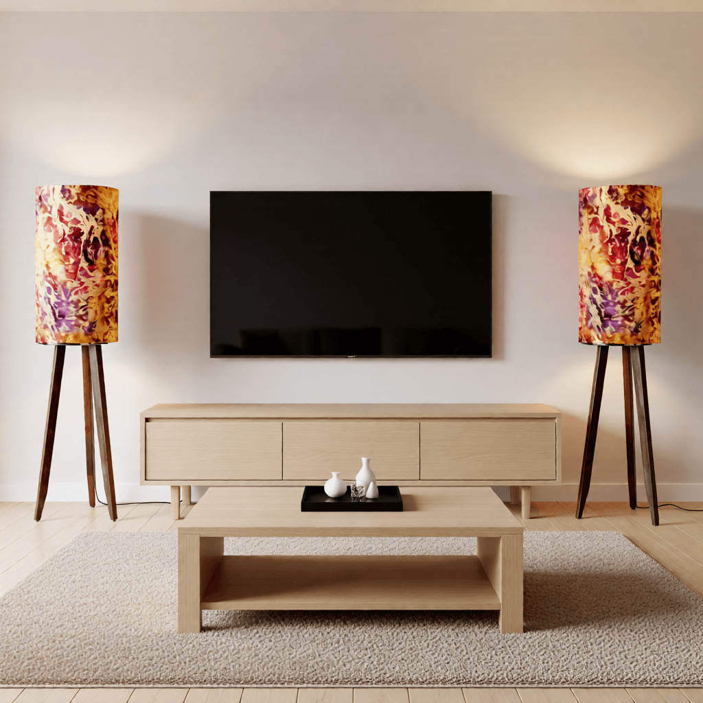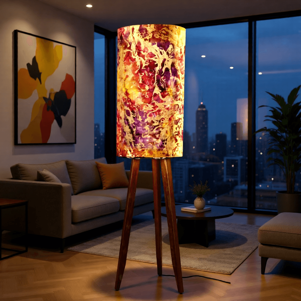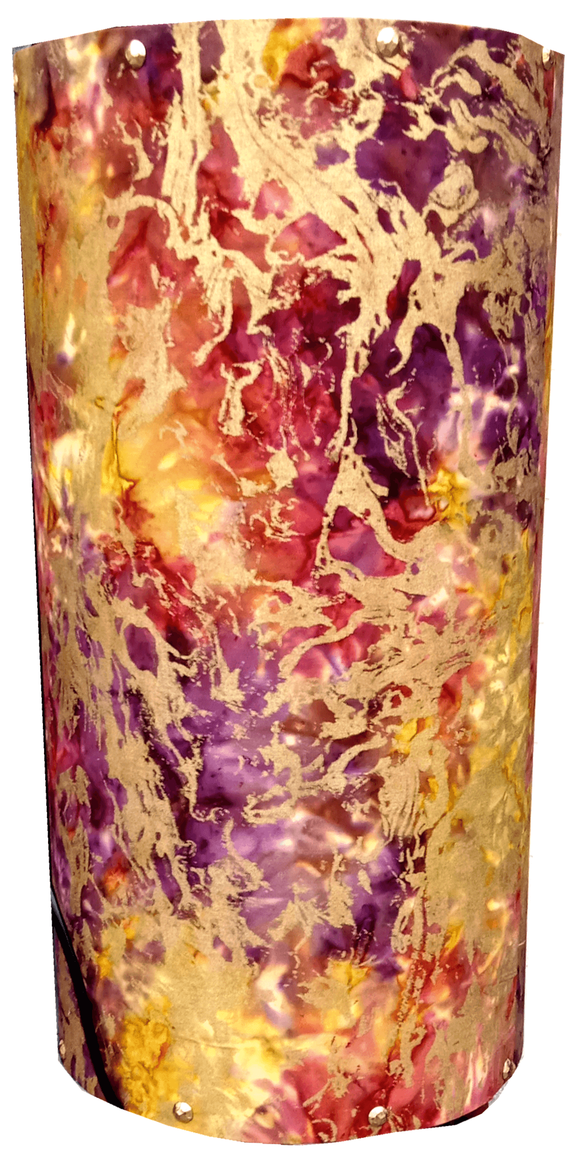 This bespoke floor lamp from Pelham Art brings a rich, artistic glow to any room. Standing 120 cm tall, it features a 50 cm cylindrical batik fabric shade, blending purple, pink, yellow and intricate gold motifs. Finished with metal studs top and bottom, the shade adds texture, colour and a touch of cultural elegance.