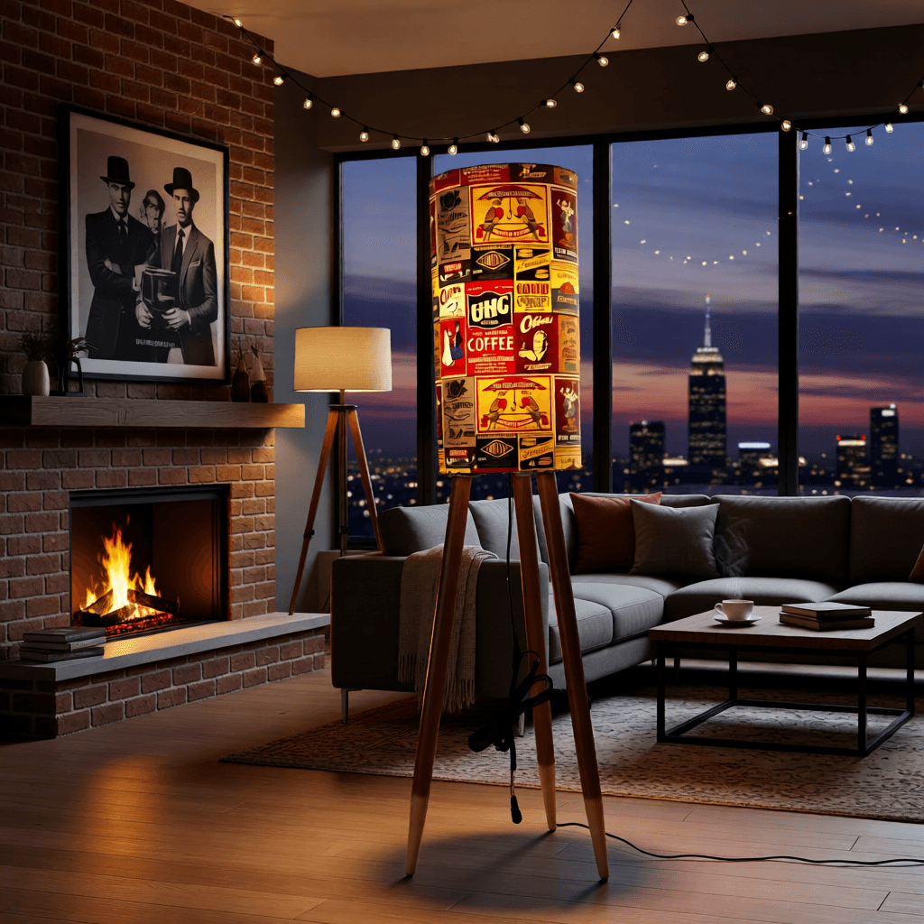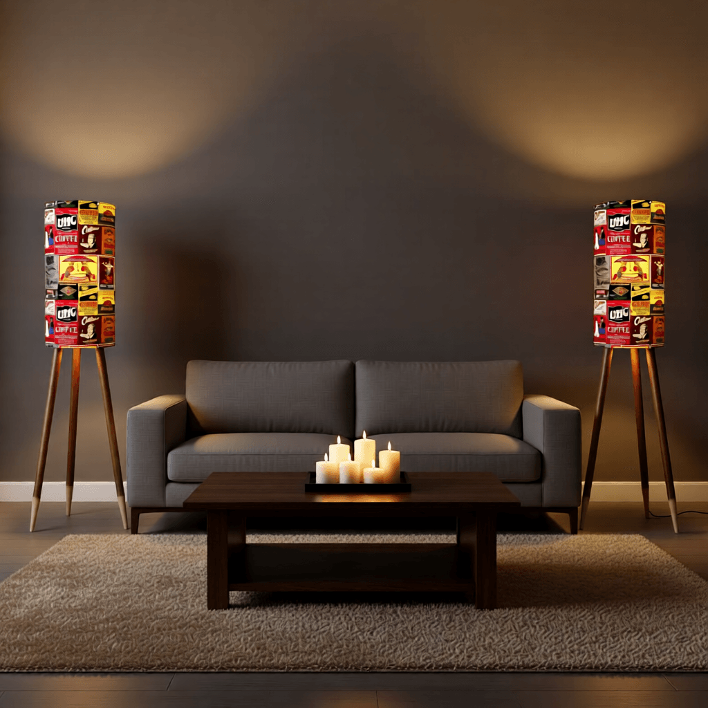 Industrial warmth meets handcrafted charm in this 120 cm Pelham Art floor lamp. The 50 cm cylindrical vintage coffee shade blends rich reds and yellows inspired by worn factory walls, aged signage and nostalgic industrial colour palettes. The metal-stud detailing enhances its vintage texture.