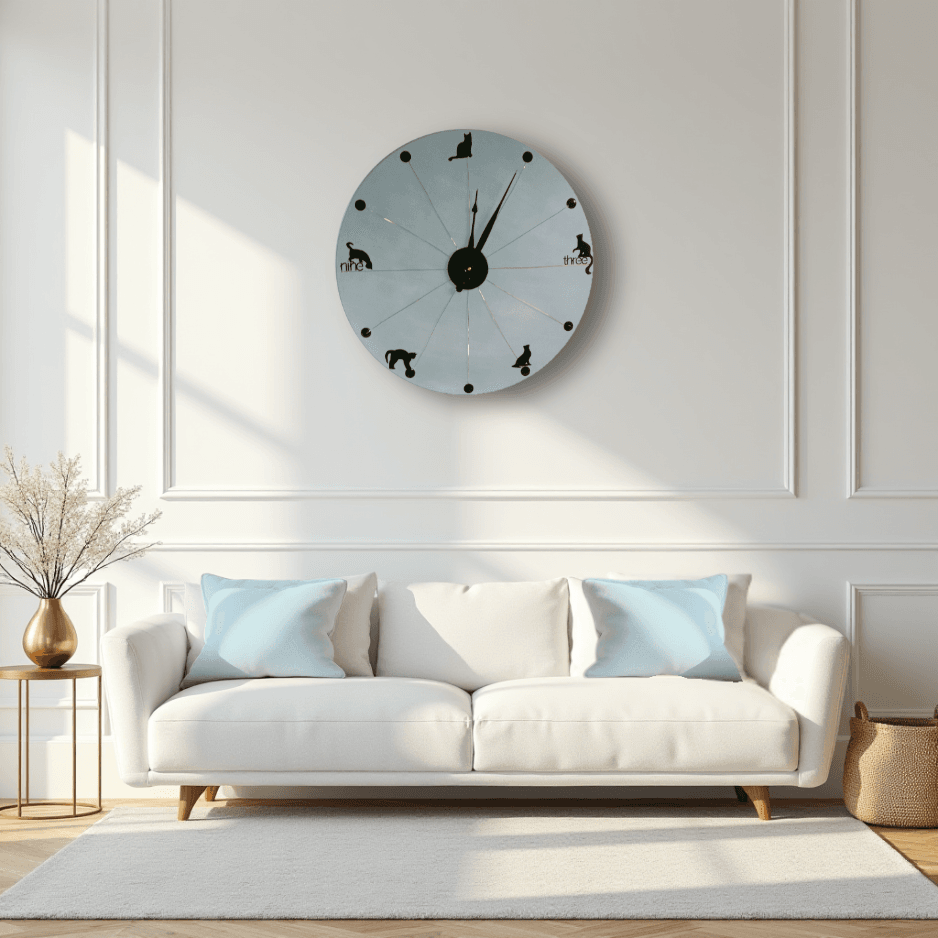 Radiating from the centre, copper wire links each number marker, creating a unique artisan look. Minimalist black dot markers define each hour, while numbers 3 and 9 feature stylised lettering. The standout feature is the row of five balancing kitty figures, giving the clock a quirky, playful charm.